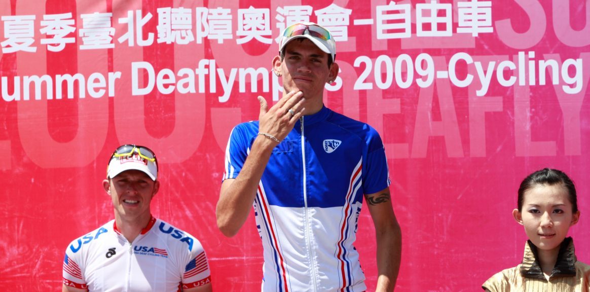 « Bonjour à tous ! Je me présente, je suis Steeve TOUBOUL, je suis cycliste de la délégation française qui partira bientôt, dimanche prochain, pour les Deaflympics à Samsum en Turquie. On m’a demandé d’être porteau-drapeau de la délégation française, ce que j’ai accepté avec plaisir, et j’en suis fier ! Merci beaucoup, ça me donne de la confiance en moi, un peu de stress aussi mais c’est pas grave . Merci beaucoup ! J’espère aussi que tous, amis, famille, personnes sur Facebook,, … vous allez partager et aime la page « France Deaflympics 2017″. Et allez la France ! A très bientôt ! » Steeve Touboul